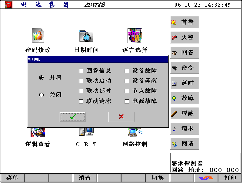 • 利達(dá)128E II火災(zāi)報(bào)警控制器在本頁可完成打印機(jī)的操作。畫面下方顯示打印機(jī)當(dāng)前狀態(tài)。